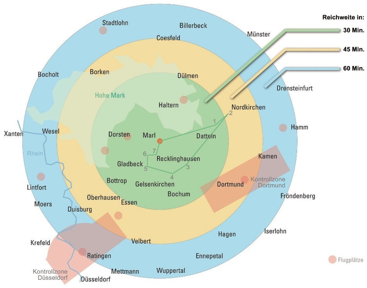 Wir starten von Marl-Loemühle aus, und fliegen in eine beliebige Richtung zu Ihrem Wunschziel.